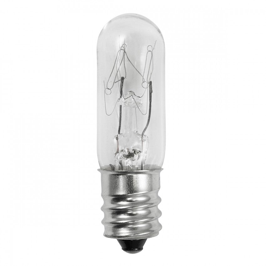 130V, 15W, T4 1/2 Miniature Bulb, E12, Dimensions: 1.88 in. Length x 0.57 in. Diameter, Clear